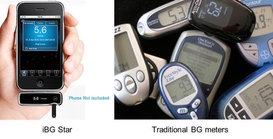 The appeal of incorporating “consumer electronics” design principles is also visually evident by comparing Sanofi’s iBG Star (a BG meter integrated with an iPhone) with the rather clunky design traditional BG meters: