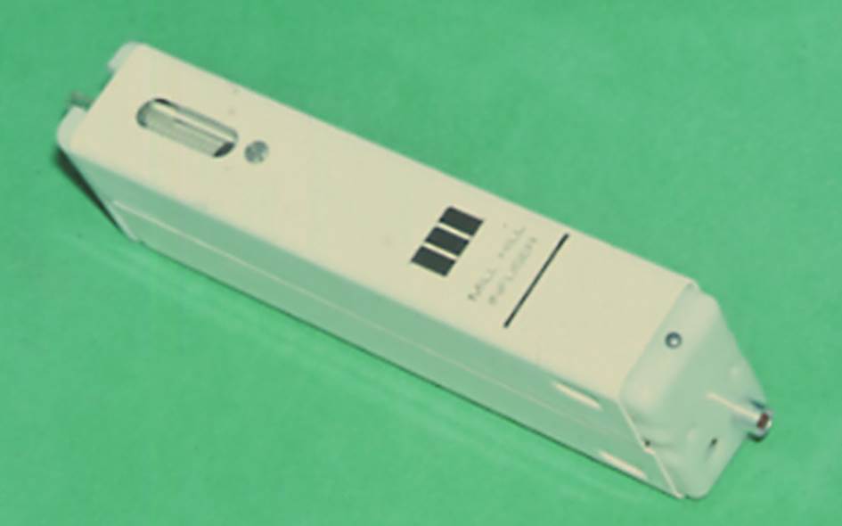 Insulin pump from the 1970s developed by John Pickup at Guys Hospital, London, by John Pickup. The button on the end was pressed to deliver the meal-time bolus, fixed at 8 times the basal rate for 15 min. This pump is now in the Science Museum in London. Photo: Insulin pump from the 1970s developed at Guys Hospital, London, by John Pickup.